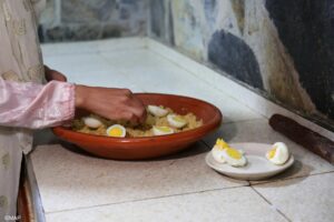 ويتم إحياء هذا العيد على الوجه الأمثل في تقاليد الطبخ التي تختص بها المنطقة من خلال أطباق رمزية تعكس ثراءها، من بينها الكسكس بالخضر ذو الحضور القوي في فن الطهي المغربي، و(هربر) الذي هو حساء بالشعير يتم تقديمه مع قليل من زيت الزيتون، وطبق الرفيسة الذي يتم إعداده بالتريد والدجاج البلدي والعدس والحلبة.