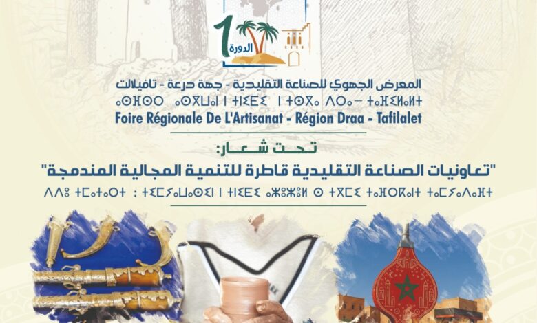 تنظم غرفة الصناعة التقليدية لجهة درعة تافيلالت، تحت إشراف عمالة إقليم تنغير، بشراكة مع كتابة الدولة المكلفة بالصناعة التقليدية والاقتصاد الاجتماعي والتضامني ومؤسسة دار الصانع الدورة الأولى للمعرض الجهوي للصناعة التقليدية، وذلك خلال الفترة الممتدة من 26 يوليوز إلى 02 غشت 2025 بمدينة تنغير، بتعاون مع وزارة الشباب والثقافة والتواصل -قطاع الثقافة والمجلس العلمي لتنغير وجماعة تنغير والمجلس الإقليمي لتنغيروالمجلس الإقليمي للسياحة لتنغير.